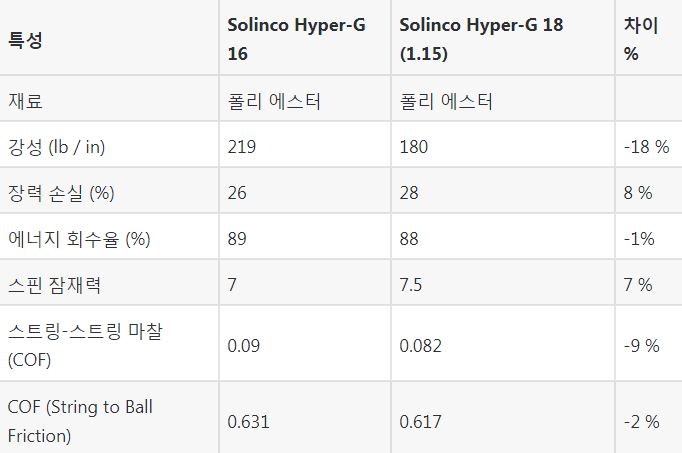 스트링 게이지 비교에 유용한 도구는 테니스 웨어하우스에서 제공하는 스트링 비교 도구도 있습니다. 아래 표에서 솔린코 하이퍼G 에 대한 데이터의 예를 살펴보세요.