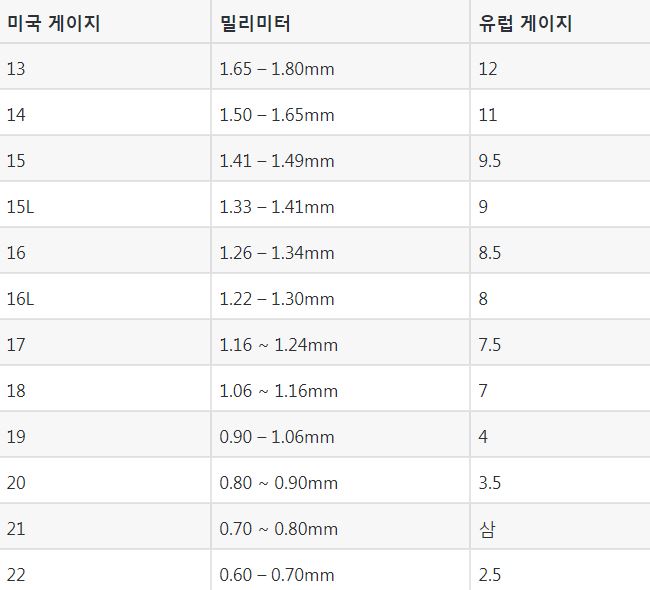 -미국에서는 숫자가 낮을수록 게이지가 두꺼워집니다.