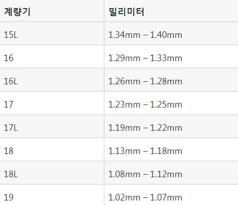 -미국에서는 숫자가 낮을수록 게이지가 두꺼워집니다.