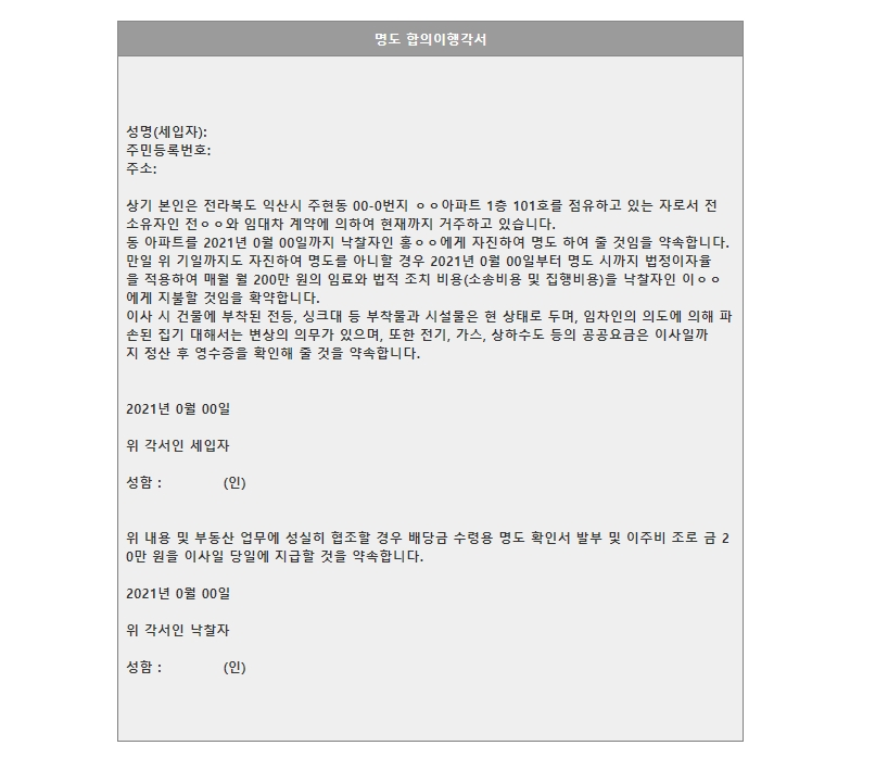 세입자용 명도 합의이행각서 예시입니다.